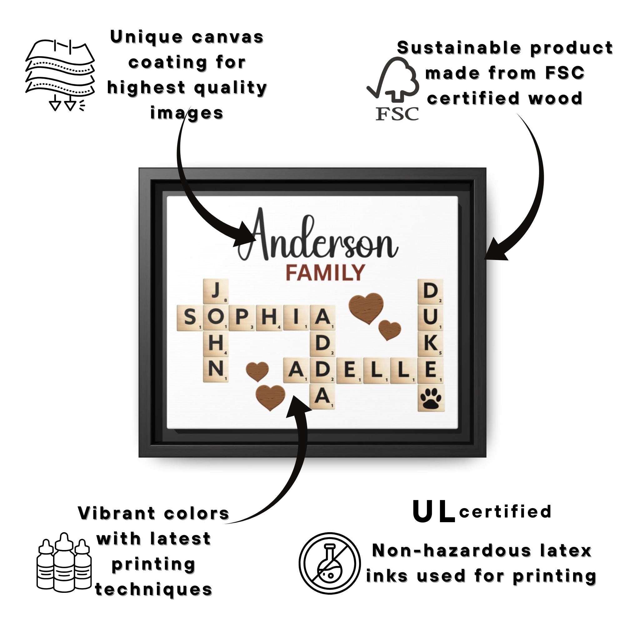 This Custom Scrabble Family Name Framed Canvas is a beautifully crafted Canvas Wall Art designed to celebrate your family connections with a stylish Scrabble Puzzle Art layout. Perfect as a Personalized Family Gift or a Grandparents Christmas Gift, this Wooden Crossword Puzzle features vivid Matte Canvas Artwork that adds warmth and charm to any home. Each piece arrives framed, ready to hang, and includes free U.S. shipping for a seamless experience.