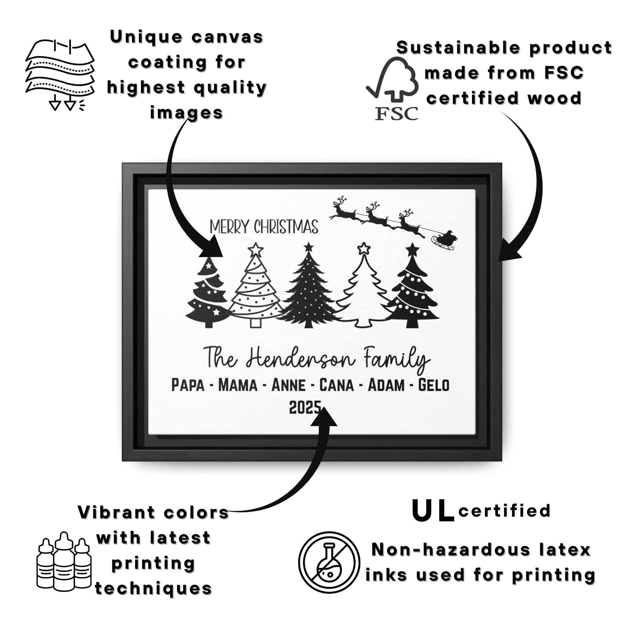 This Custom Family Print features five unique Christmas trees personalized with each family member’s name, creating a heartwarming holiday keepsake. Printed on premium matte canvas, it adds festive charm and a modern touch to your home. Perfect for decorating the living room, bedroom, nursery, kitchen, hallway, or above the bed, it brings the spirit of Christmas to every corner. A thoughtful gift for parents, grandparents, Mom, Dad, Grandma, Abuelita, Auntie, sister, friends, or Pop Pop to celebrate Christmas, anniversaries, engagements, Mother’s Day, Father’s Day, or Grandparents Day. This personalized family Christmas canvas captures love, unity, and holiday joy in one stunning piece.